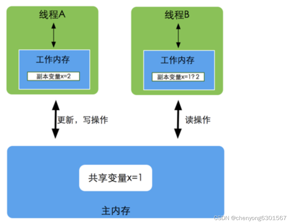 假设主内存中存在一个共享变量x,现在有A和B两条线程分别对该变量x=1进行操作,A/B线程各自的工作内存中存在共享变量副本x。假设现在A线程想要修改x的值为2,而B线程却想要读取x的值,那么B线程读取到的值是A线程更新后的值2还是更新前的值1呢?答案是,不确定,即B线程有可能读取到A线程更新前的值1,也有可能读取到A线程更新后的值2,这是因为工作内存是每个线程私有的数据区域,而线程A变量x时,首先是将变量从主内存拷贝到A线程的工作内存中,然后对变量进行操作,操作完成后再将变量x写回主内,而对于B线程的也是类似的,这样就有可能造成主内存与工作内存间数据存在一致性问题,假如A线程修改完后正在将数据写回主内存,而B线程此时正在读取主内存,即将x=1拷贝到自己的工作内存中,这样B线程读取到的值就是x=1,但如果A线程已将x=2写回主内存后,B线程才开始读取的话,那么此时B线程读取到的就是x=2,但到底是哪种情况先发生呢?