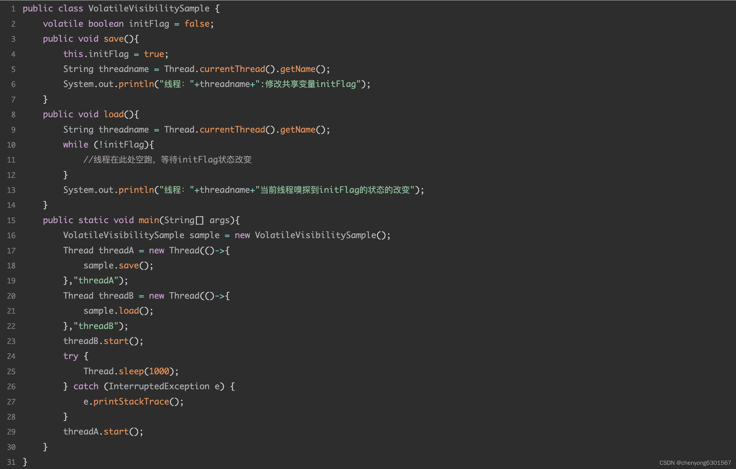 在并发场景下,i变量的任何改变都会立马反应到其他线程中,但是如此存在多条线程同时调用increase()方法的话,就会出现线程安全问题,毕竟i++;操作并不具备原子性,该操作是先读取值,然后写回一个新值,相当于原来的值加上1,分两步完成,如果第二个线程在第一个线程读取旧值和写回新值期间读取i的域值,那么第二个线程就会与第一个线程一起看到同一个值,并执行相同值的加1操作,这也就造成了线程安全失败,因此对于increase方法必须使用synchronized修饰,以便保证线程安全,需要注意的是一旦使用synchronized修饰方法后,由于synchronized本身也具备与volatile相同的特性,即可见性,因此在这样种情况下就完全可以省去volatile修饰变量。