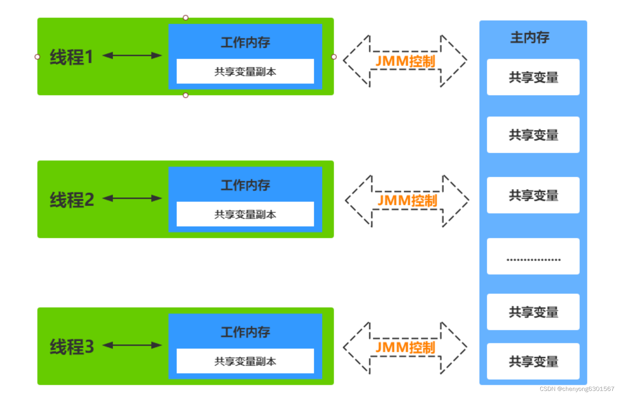 Java内存模型(Java Memory Model简称JMM)是一种抽象的概念,并不真实存在,它描述的是一组规则或规范,通过这组规范定义了程序中各个变量(包括实例字段,静态字段和构成数组对象的元素)的访问方式。JVM运行程序的实体是线程,而每个线程创建时JVM都会为其创建一个工作内存(有些地方称为栈空间),用于存储线程私有的数据,而Java内存模型中规定所有变量都存储在主内存,主内存是共享内存区域,所有线程都可以访问,但线程对变量的操作(读取赋值等)必须在工作内存中进行,首先要将变量从主内存拷贝的自己的工作内存空间,然后对变量进行操作,操作完成后再将变量写回主内存,不能直接操作主内存中的变量,工作内存中存储着主内存中的变量副本拷贝,前面说过,工作内存是每个线程的私有数据区域,因此不同的线程间无法访问对方的工作内存,线程间的通信(传值)必须通过主内存来完成。