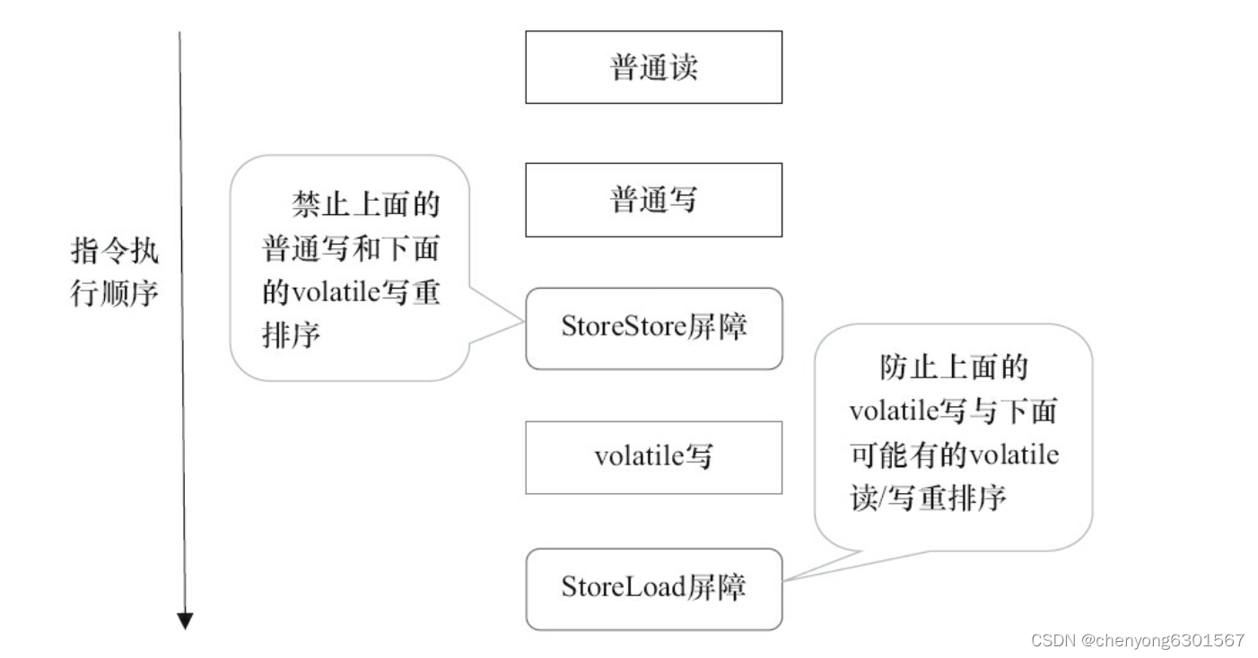 上图中StoreStore屏障可以保证在volatile写之前,其前面的所有普通写操作已经对任意处理器可见了。这是因为StoreStore屏障将保障上面所有的普通写在volatile写之前刷新到主内存。