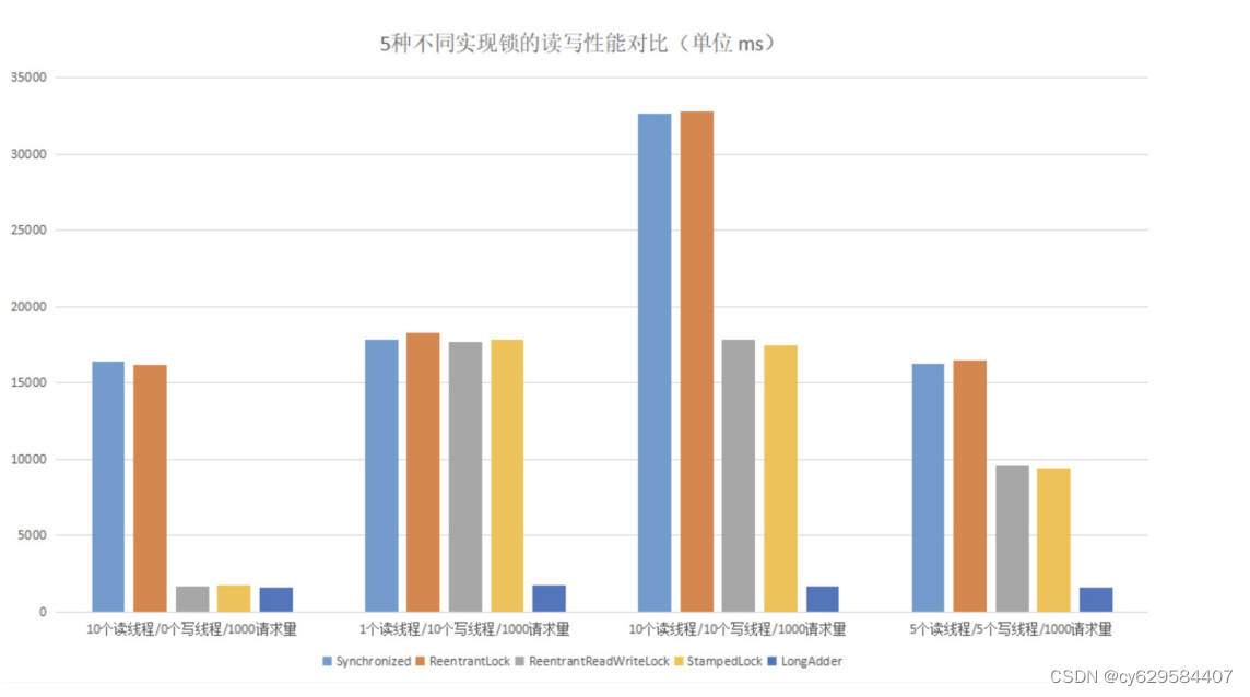 的读写性能是最好的;在写大于读的场景下,乐观锁的性能是最好的,其它 4 种锁的性能则相差不多;在读和写差不多