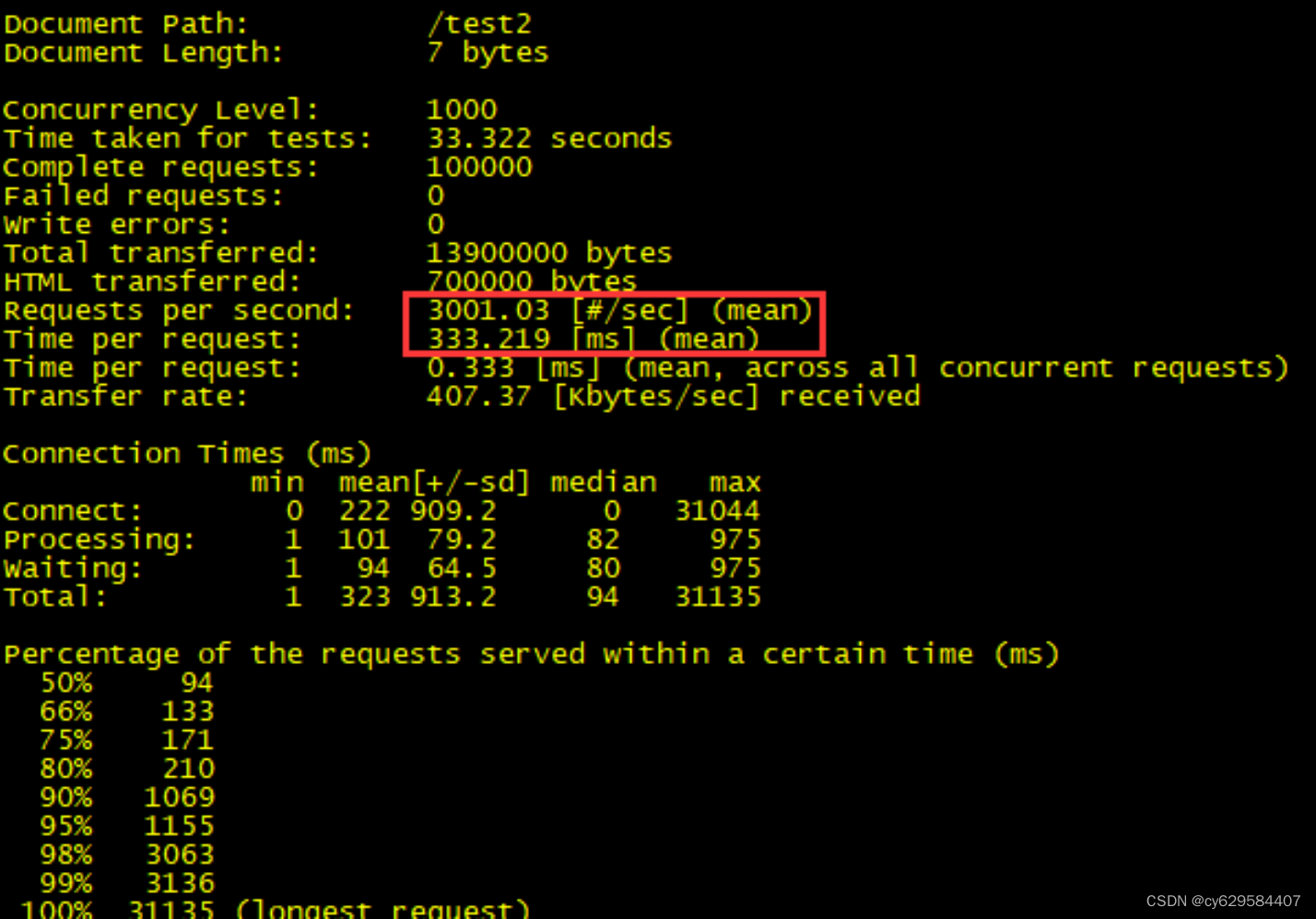 再进行 AB 性能测试,我们可以看到吞吐量提升了,响应时间降低了。