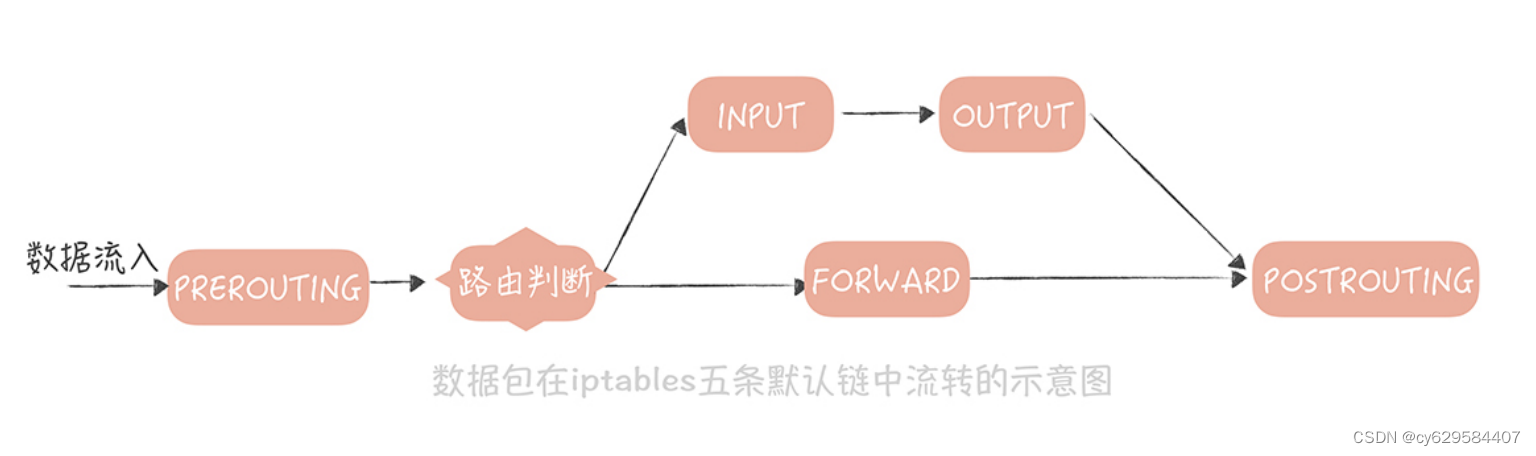 Netfilter,实现地址转换的功能。在 iptables 中默认有五条链,你可以把这五条链,当作