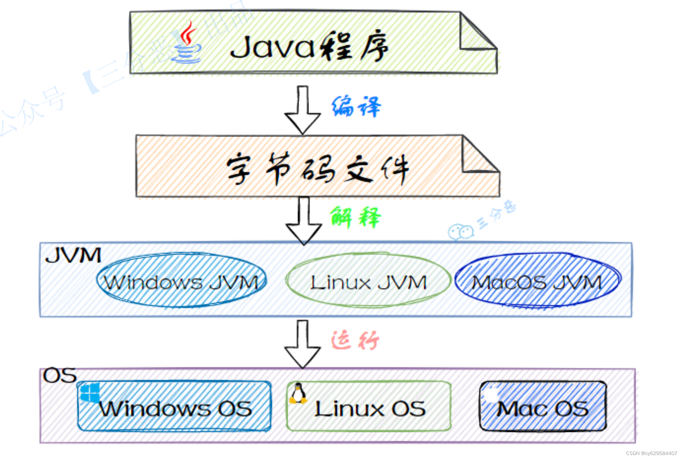 件),这种字节码必须再经过JVM,解释成操作系统能识别的机器码,在由操作系统执⾏。