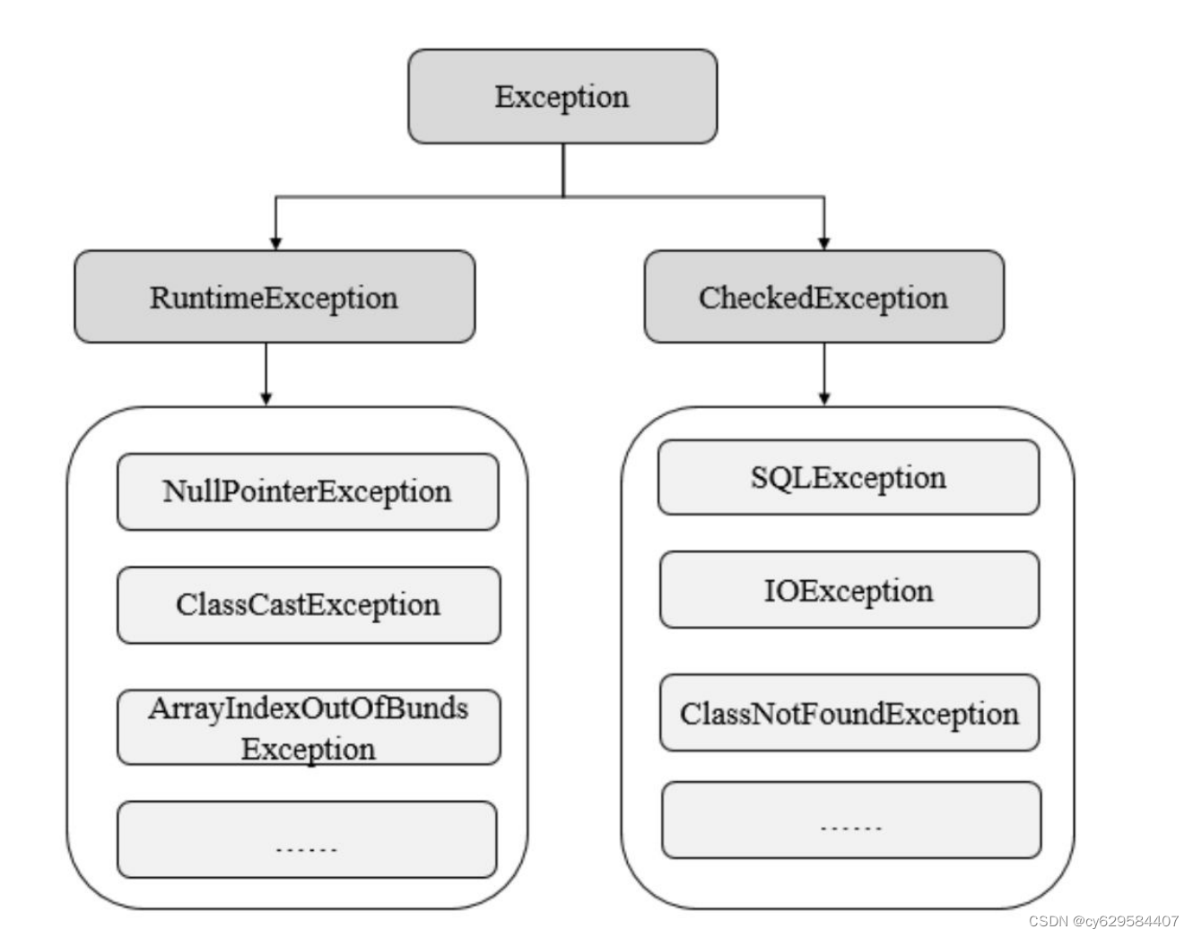 CheckedException有由于I/O 错误导致的IOException、SQLException、ClassNotFoundException等。 该类异常一般由于打开错误的文件、SQL语法错误、类不存在等引起。