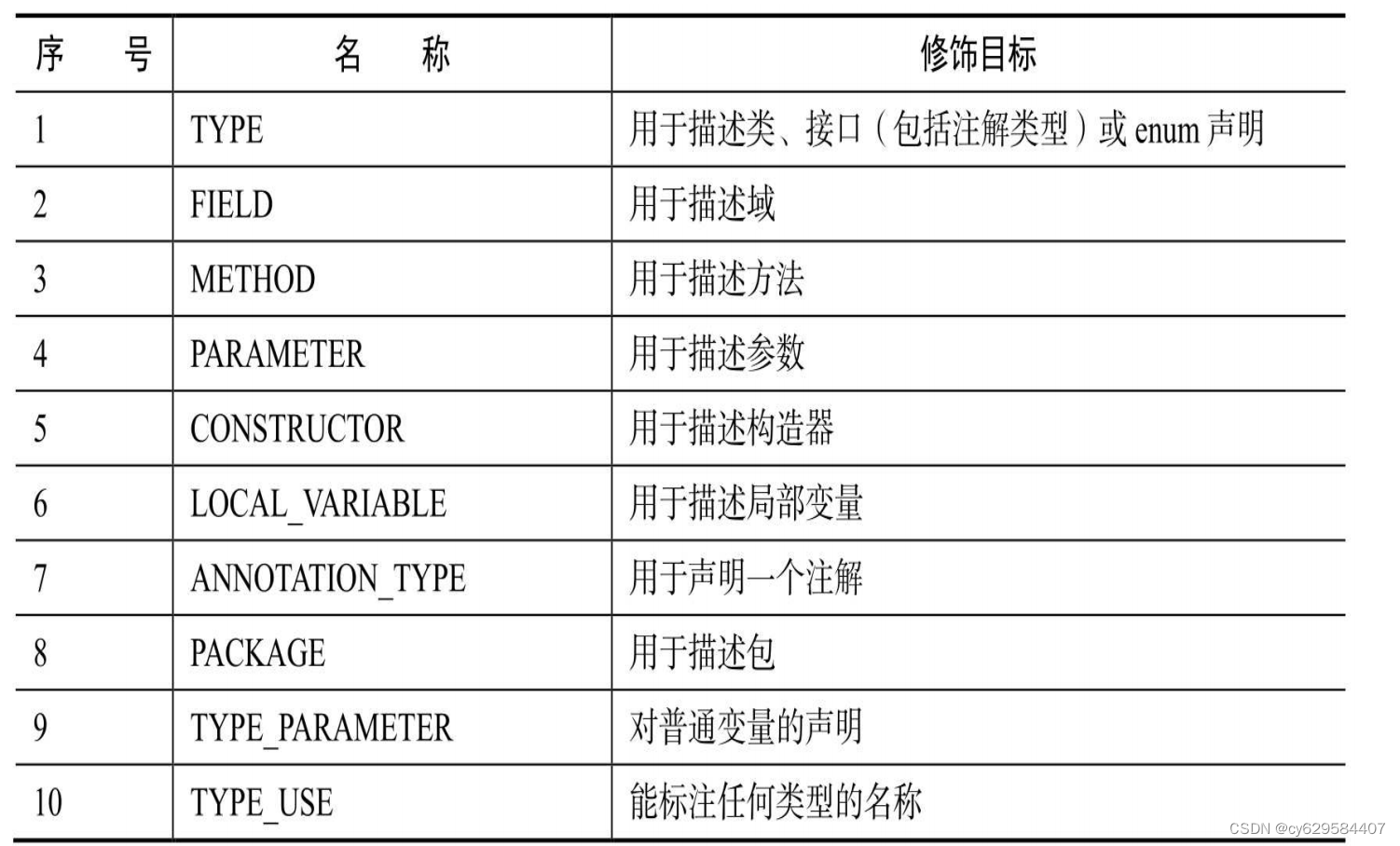 量(循环变量、catch参数等)。在注解类型的声明中使用了target,可更加明确其修饰的目标,