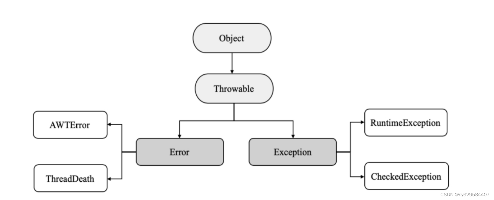 Error有AWTError、ThreadDeath,Exception又可分为RuntimeException和CheckedException