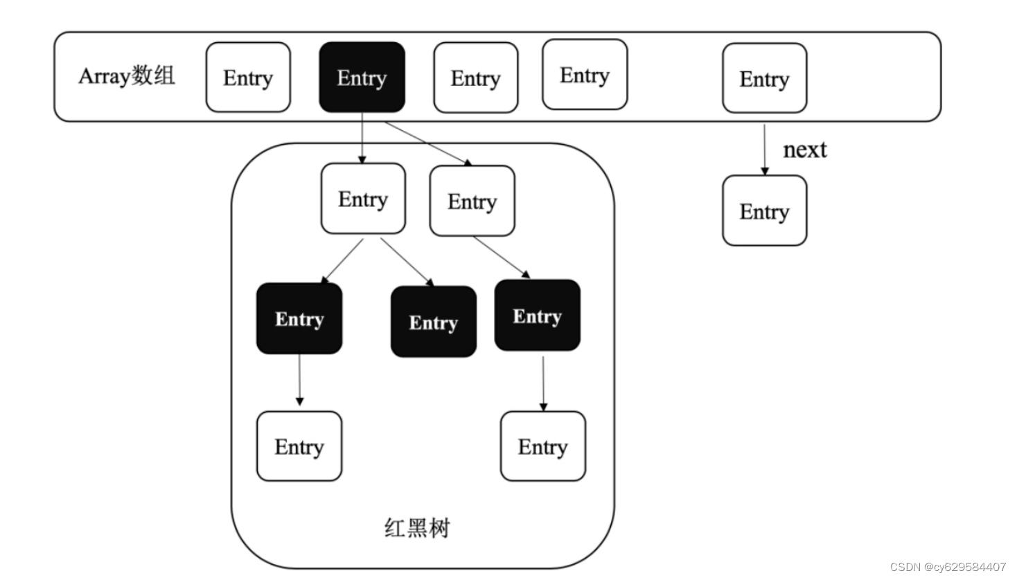 此其时间复杂度为O(log N )。Java 8 HashMap的数据结构如图