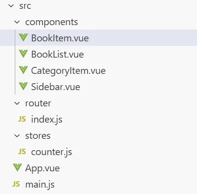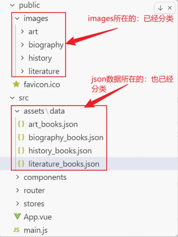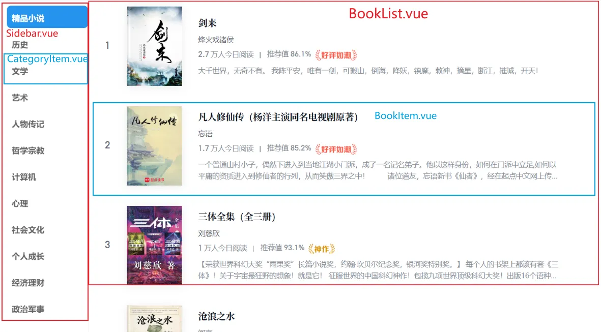 App.vue (根组件) ├── Sidebar.vue (左侧导航栏组件) │ └── CategoryItem.vue (单个分类项组件 - 可选) └── BookList.vue (书籍列表组件) └── BookItem.vue (单个书籍卡片组件)- 至于数据,当然并不着急导入,我们一步一步地去搭建这一个页面