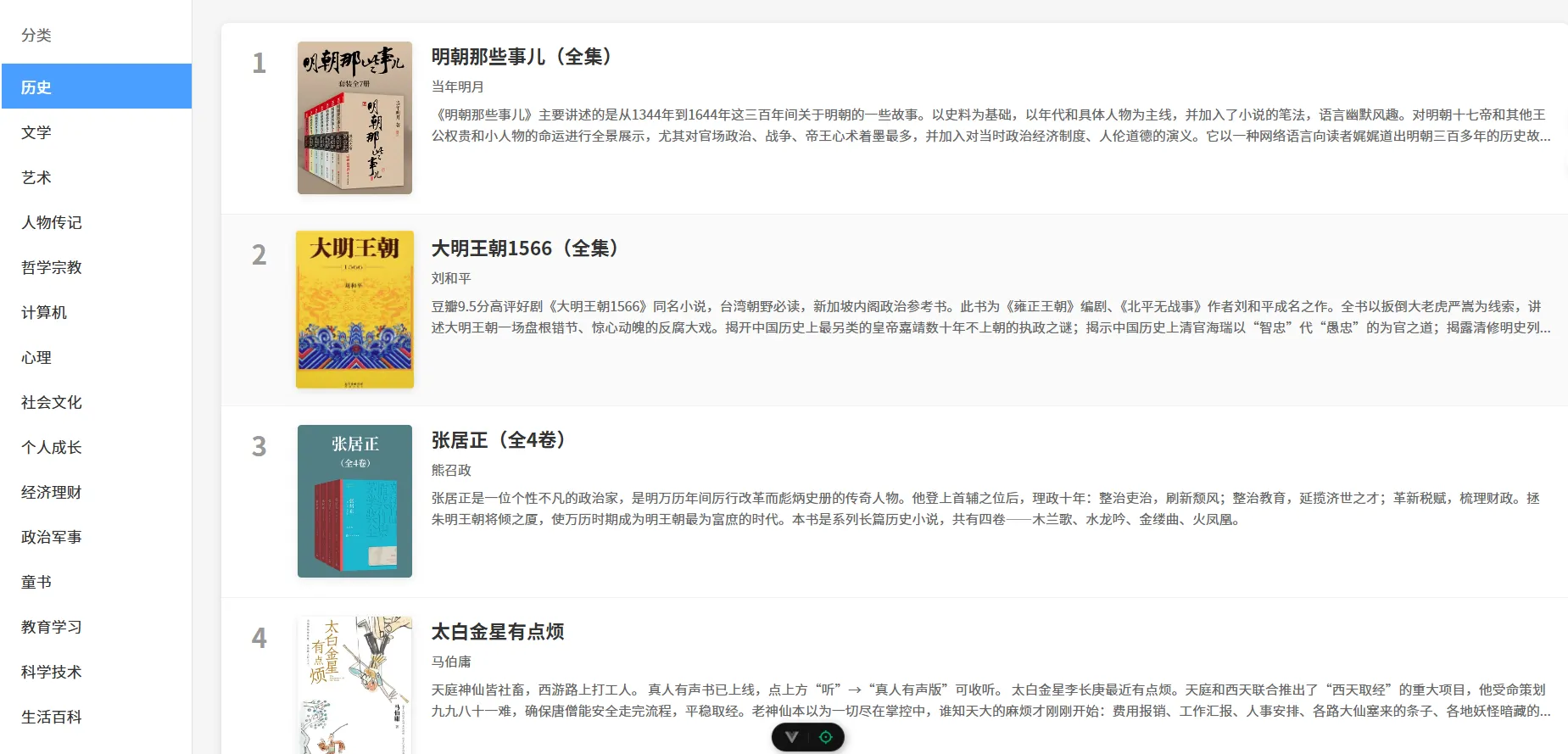 打算弄到这种程度吧,一个简单的分类页面,不包括上面的细分领域,仅仅只包括历史、文学、艺术、人物传记这四类真数据,其余都是假数据,不包括书本的PDF数据,仅仅只有这些书本的Json数据和图片数据