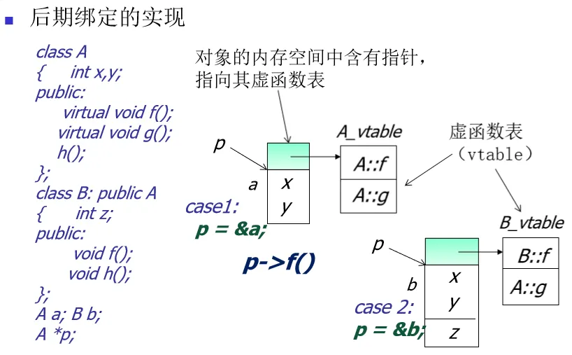 B b; // 派生类对象 A *p = &b; // ✅ 合法:基类指针指向派生类 A &r = b; // ✅ 合法:基类引用绑定派生类 -