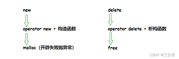 new和delete是用户进行动态内存申请和释放的操作符,operator new 和operator delete是系统提供的全局函数,new在底层调用operator new全局函数来申请空间,delete在底层通过operator delete全局函数来释放空间。