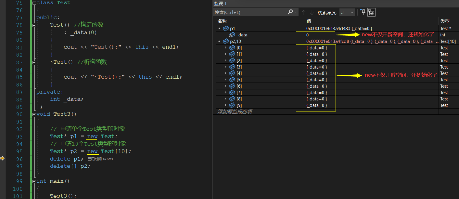 定位new表达式在实际中一般是配合内存池使用。因为内存池分配出的内存没有初始化,所以如果是自定义类型的对象,需要使用new的定义表达式进行显示调构造函数进行初始化。class Test { public: Test(int date = 2) : _data(date) { cout << "Test():" << this << endl; } ~Test() { cout << "~Test():" << this << endl; } private: int _data; }; int main() { // pt现在指向的只不过是与Test对象相同大小的一段空间,还不能算是一个对象,因为构造函数没有执行 Test* pt1 = (Test*)operator new(sizeof(Test)); //new (place_address) type new(pt1)Test; // 注意:如果Test类的构造函数有参数时,此处需要传参 //释放空间delete的过程:析构+operator = new pt1->~Test(); operator delete(pt1); //new(place_address) type(initializer - list) Test* pt2 = (Test*)operator new(sizeof(Test)); new(pt2)Test(10); //释放空间delete的过程:析构+operator = new pt2->~Test(); operator delete(pt2); //对于pt1的操作,等价于如下,pt2同理: /* Test* pt1 = new Test; delete pt1; */ }
