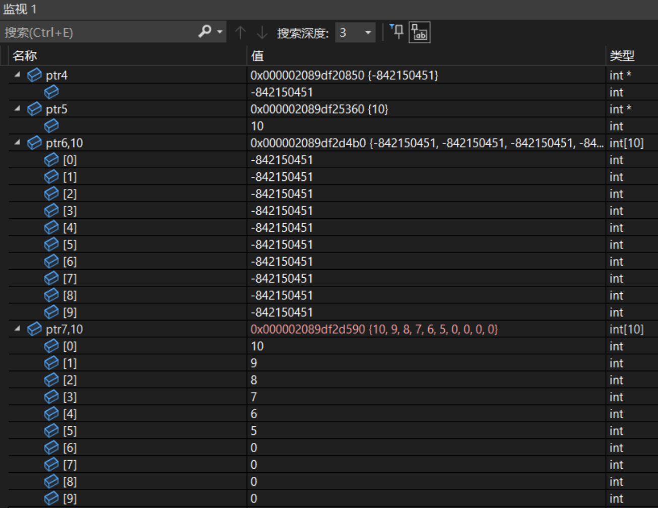 int* ptr7 = new int[10]{ 10,9,8,7,6,5 }; //跟数组的初始化很像,大括号有几个,初始化几个,其余为0。不过C++11才支持的语法