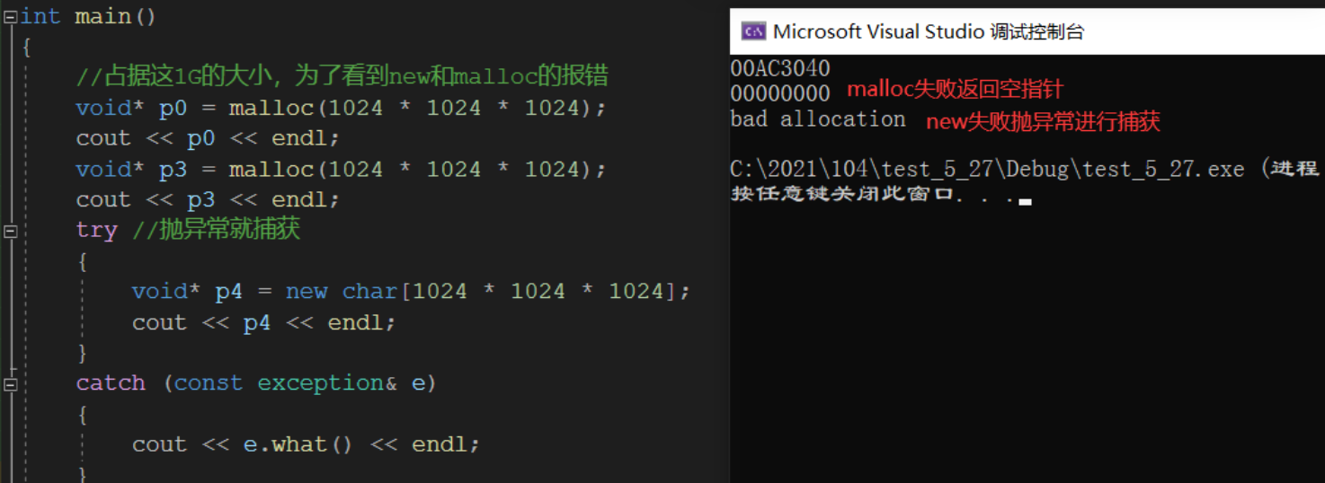 但是还有一个点,使用fmalloc如若开辟内存失败,会返回空指针,但是new失败会抛异常。