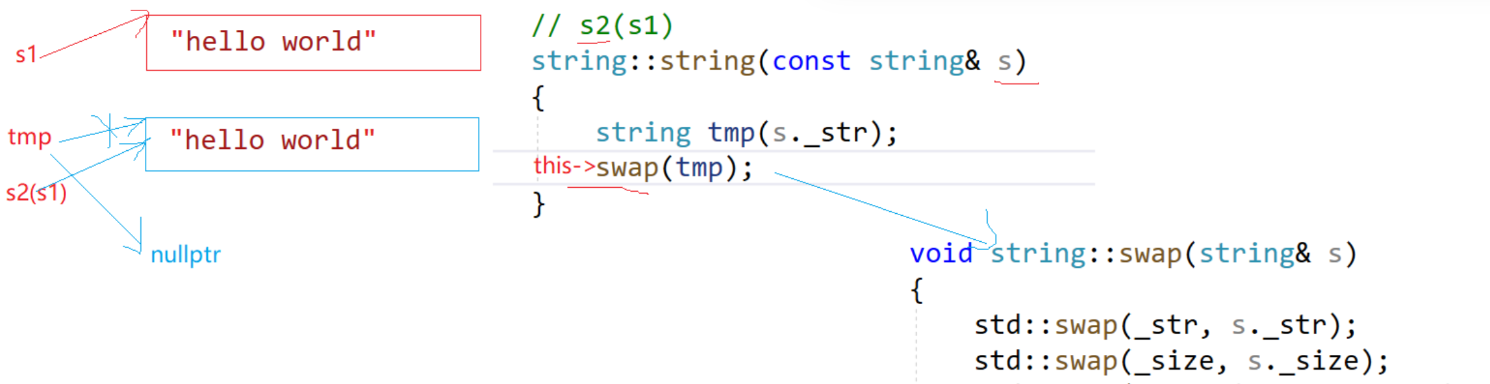 现代写法借助了tmp来构造,s._str 是深拷贝的源头,调用成员函数 swap,交换 *this 与 tmp 的资源,交换后,*this 获得 tmp 的资源(就是拷贝后的字符串),而 tmp 持有原对象的空/无效状态。