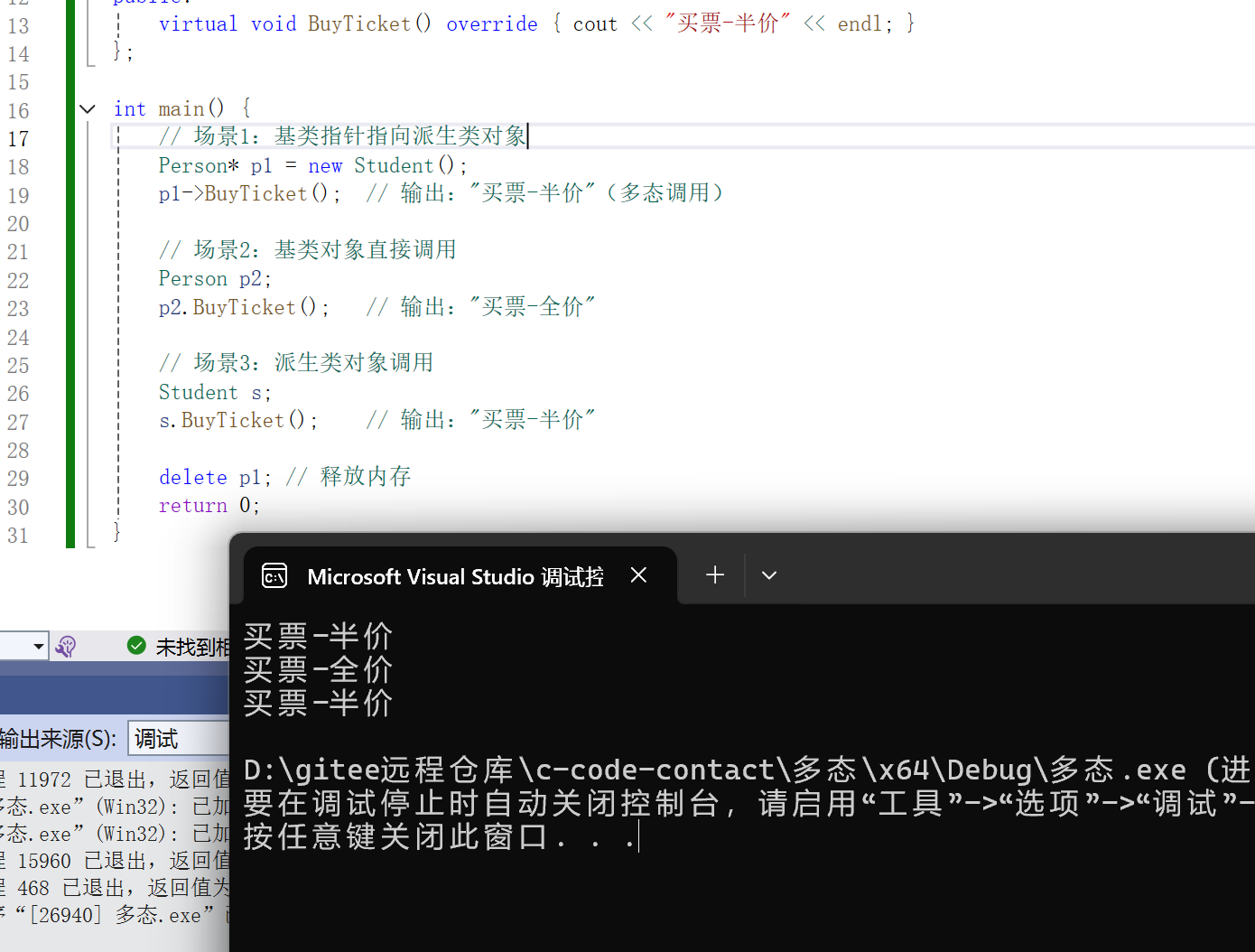 p1->BuyTicket(); // 输出:"买票-半价"(多态调用)
