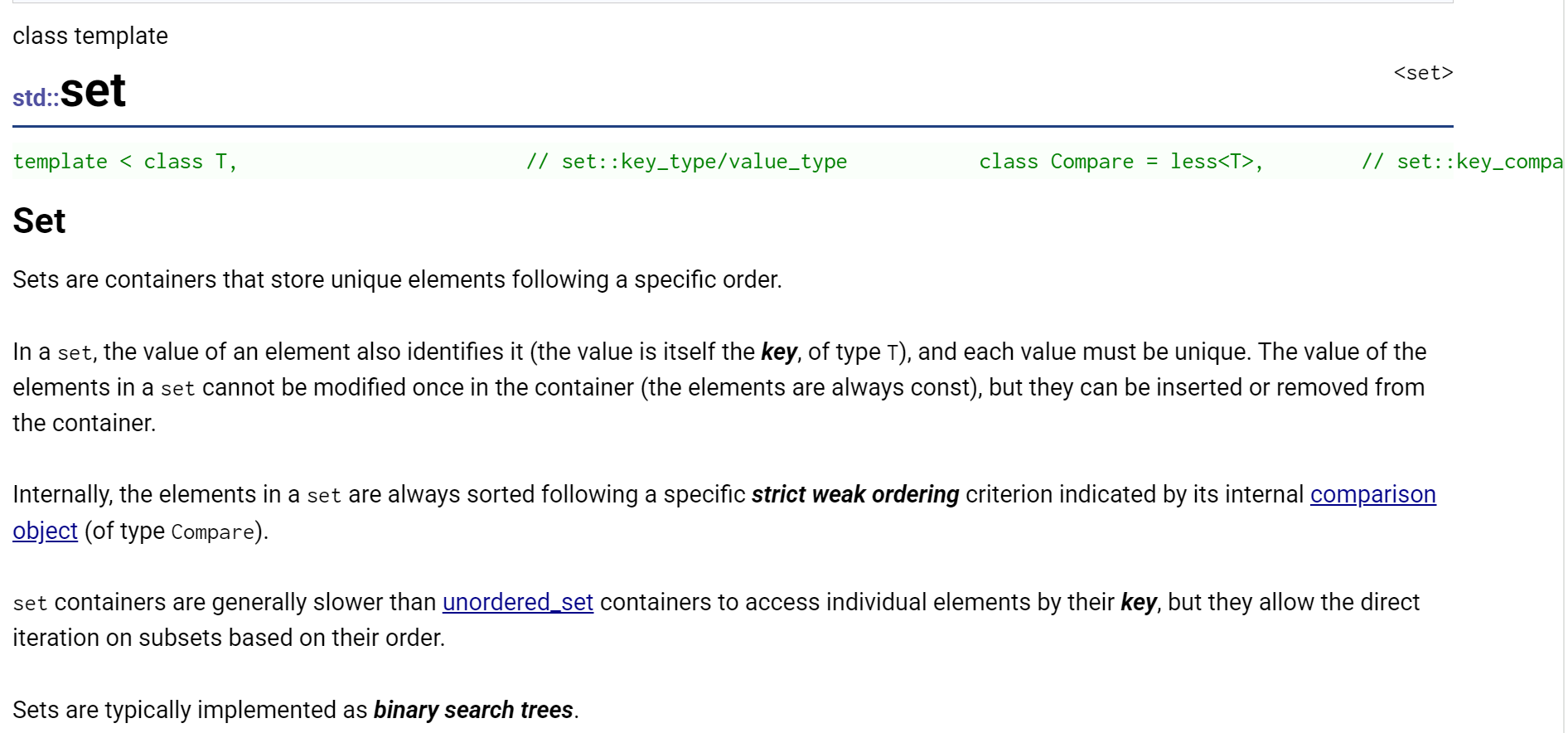 3. 在内部,set中的元素总是按照其内部比较对象(类型比较)所指示的特定严格弱排序准则进行排序。