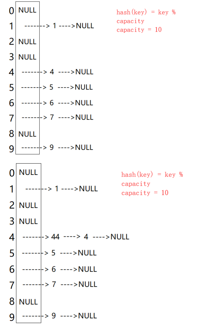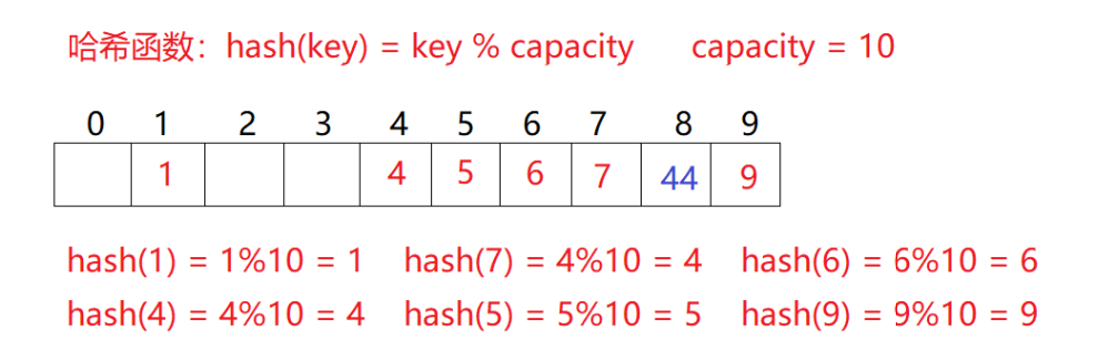 问题:按照上述哈希方式,向集合中插入元素44,会出现什么问题?