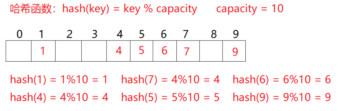 哈希函数设置为:hash(key) = key % capacity; capacity为存储元素底层空间总的大小。