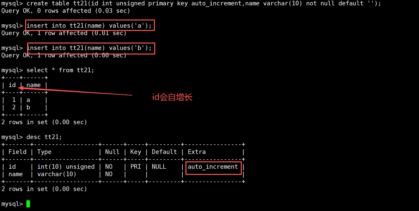 auto_increment:当对应的字段,不给值,会自动的被系统触发,系统会从当前字段中已经有的最大值