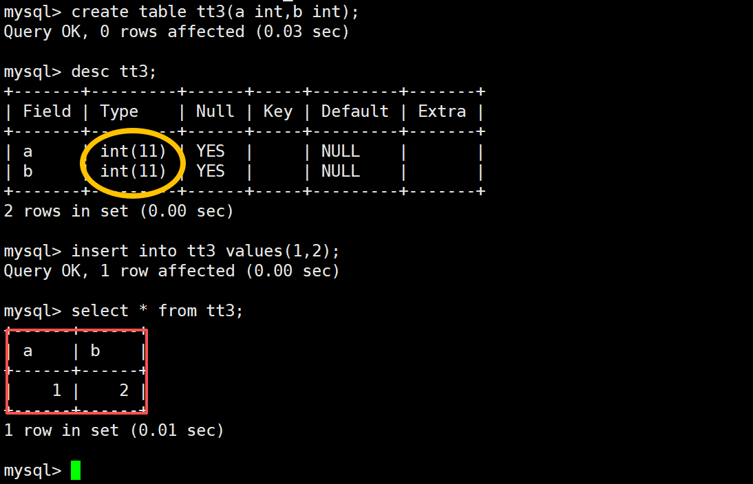 如果我们建立一个两个整型a和b的表,我们会发现int(11)是什么东西,好像没有zerofill存在。