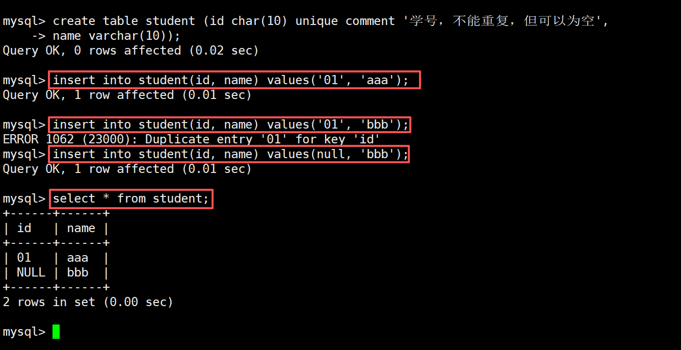 唯一键的本质和主键差不多,唯一键允许为空,而且可以多个为空,空字段不做唯一性比较。关于唯一键和主键的区别: