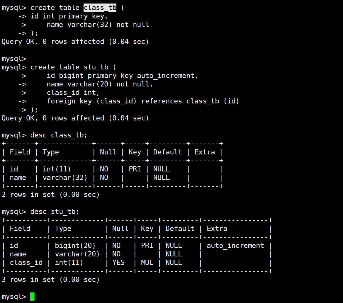 理论上,上面的例子,我们不创建外键约束,就正常建立学生表,以及班级表,该有的字段我们都有。