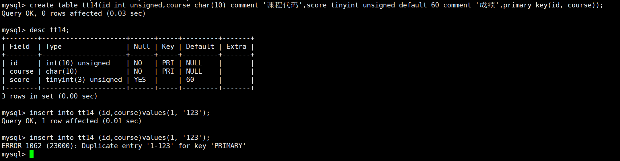 如果我们需要有多个字段作为主键,也可以使用复合主键。比如假设我们有这样的学生抢课场景,同一个学生可以选择多门课程,多个学生可以选择同一个课程,但是一个学生不能重复选择同一个课程,此时如果我们就可以使用复合主键了。复合主键在创建表的时候,在所有字段定义完之后,使用primary key(主键字段列表)来创建主键。