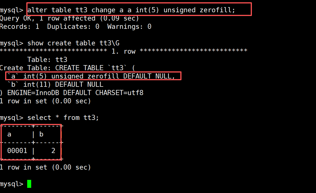 但是对列添加了zerofill属性后,显示的结果就有所不同了。修改tt3表的属性: