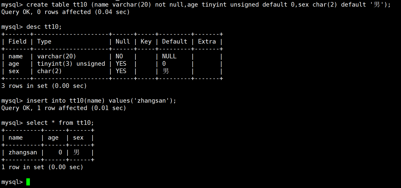 这里可以看到,我们并没有为zhangsan指定sex字段,但是我们在定义时便使用了default。所以这里使用的是默认值。