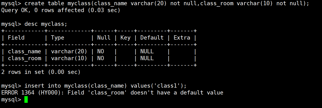 这里我们可以看到,缺少班级教室的字段无法插入,这样我们就叫做是空属性的约束。