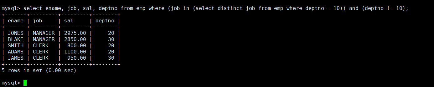 最后,题目要求查询结果不包括部门编号为10本身,所以我们可以再将上述查找出的结果加上deptno不等于10的限制条件即可。输入语句select ename, job, sal, deptno from emp where (job in (select distinct job from emp where deptno = 10)) and (deptno != 10);