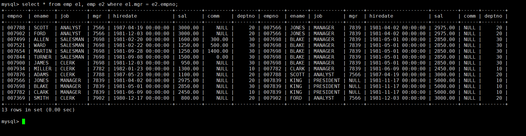 所以我们首先要查找员工领导编号mgr和该员工自己的编号empno相等的数据,输入指令select * from emp e1, emp e2 where e1.mgr = e2.empno;