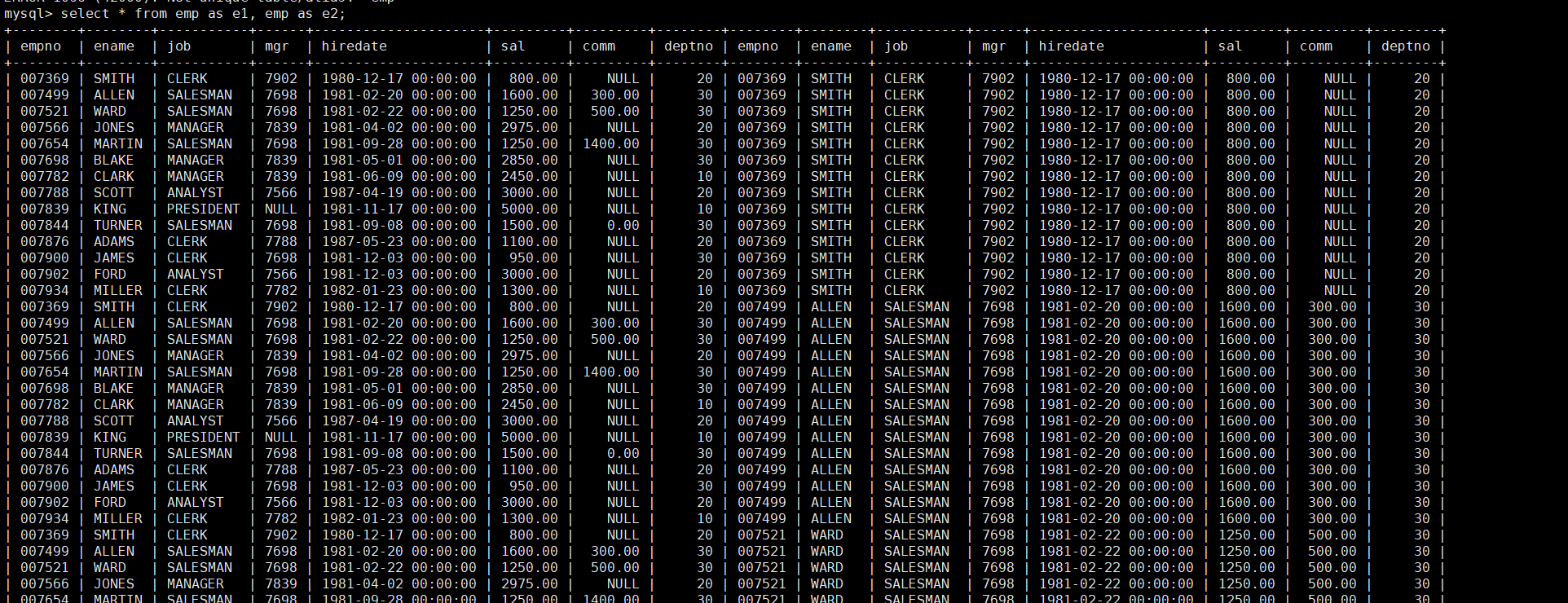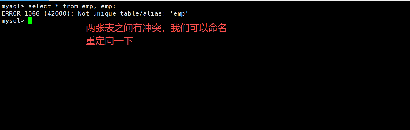 输入指令select * from emp, emp;我们会发现报错了,查询不了。原因是两张相同的表有重复的冲突元素。解决这个问题,我们可以将两张相同的表分别重命名为两个不一样的名字,输入指令select * from emp as e1, emp as e2;这样就实现了自连接查询。