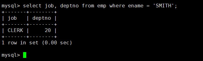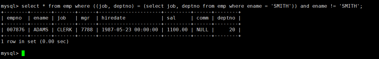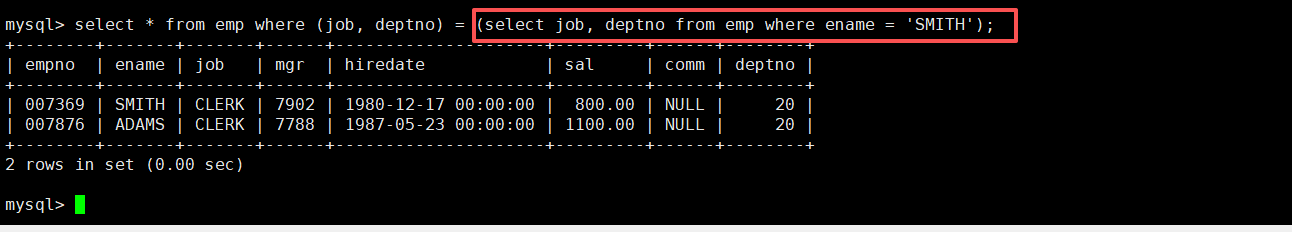 然后我们查询和SMITH的部门和岗位完全相同的所有雇员,多列查询可以使用如下类型的语句:select * from emp where (job, deptno) = (select job, deptno from emp where ename = 'SMITH');