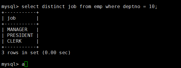 做这道题首先可以查找出emp表中部门号为10的所有员工的工作岗位,输入语句select distinct job from emp where deptno = 10;