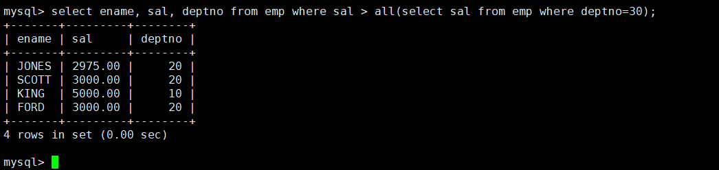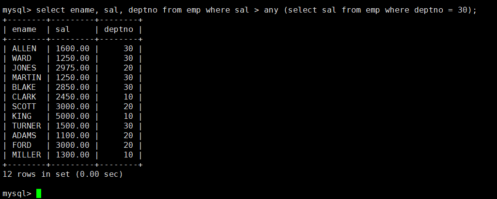 例如我们想在emp表中显示工资比部门30的任意员工的工资高的员工的姓名、工资和部门号(包含自己部门的员工),输入语句select ename, sal, deptno from emp where sal > any (select sal from emp where deptno = 30);