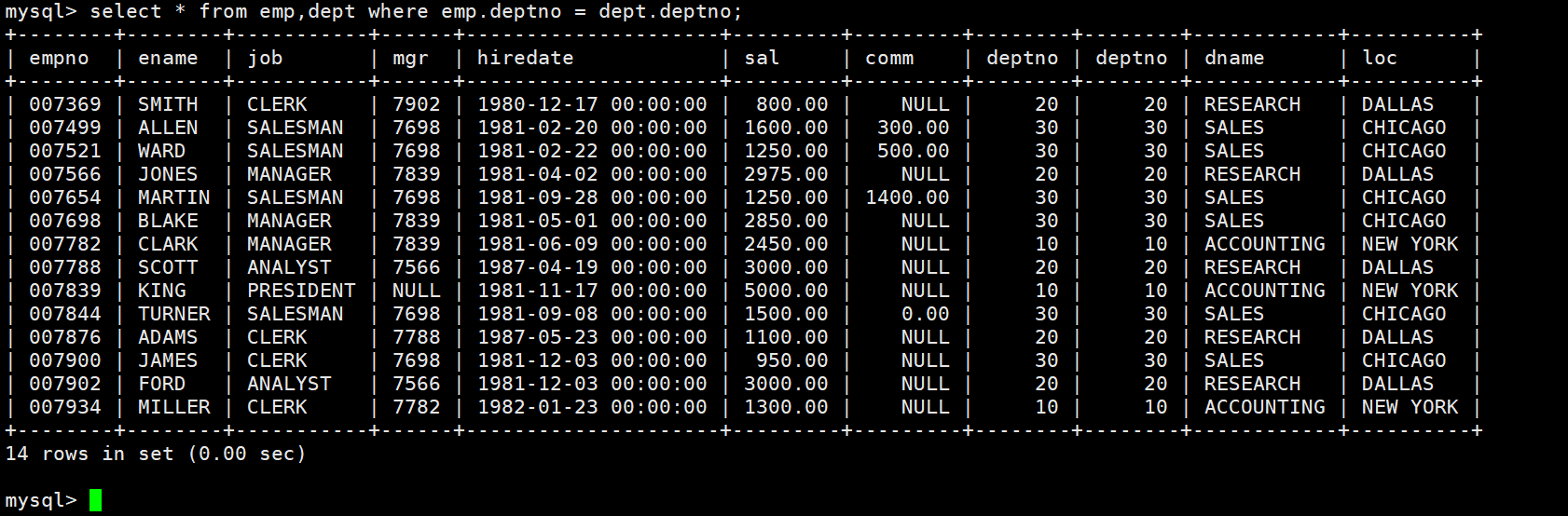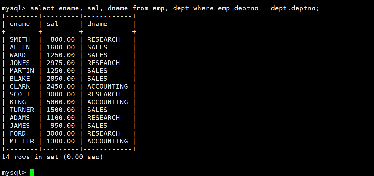 因为上面的数据来自EMP和DEPT表,因此要联合查询,MySQL的select语句其实不是一次只能查询一张表,它可以一次性查询多张表,表与表之间用逗号隔开,例如我们想要查找emp表和dept表,输入指令select * from emp,dept;即可查询到两张表的组合: