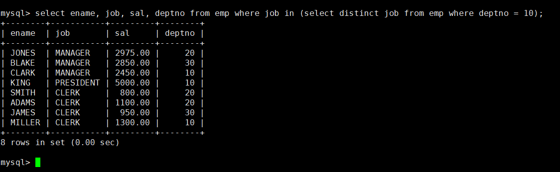 选择出来之后,我们再用in关键字,选择出job列属于上述结果的员工,显示他们的名字、岗位、工资和部门号,输入语句select ename, job, sal, deptno from emp where job in (select distinct job from emp where deptno = 10);