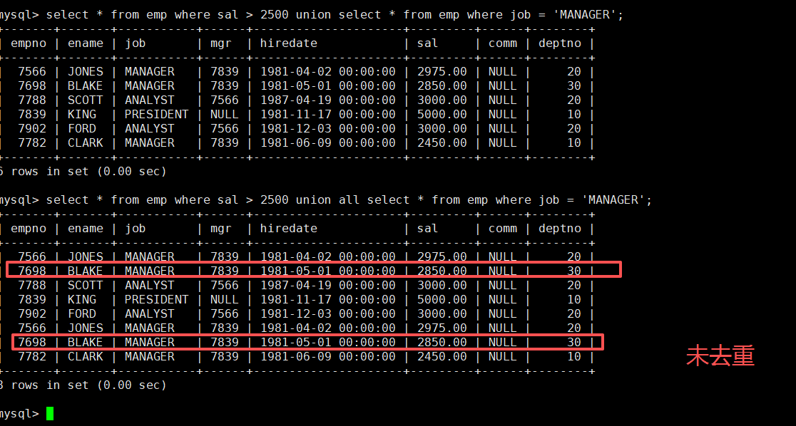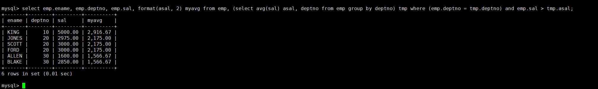 最后去重一下,再进行筛选,输入语句:select emp.ename, emp.deptno, emp.sal, format(asal, 2) myavg from emp, (select avg(sal) asal, deptno from emp group by deptno) tmp where (emp.deptno = tmp.deptno) and emp.sal > tmp.asal;
