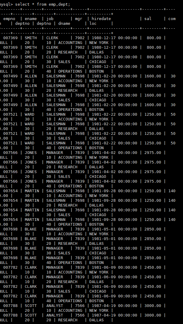 可以看到这里的表都显示不下了,这里是先从第一张表即emp表中选出第一条记录,和第二张表即dept表中的所有记录进行组合。然后从第一张表中选第二条记录,和第二张表中的所有记录进行组合。不加过滤条件,最后得到的结果称为笛卡尔积。