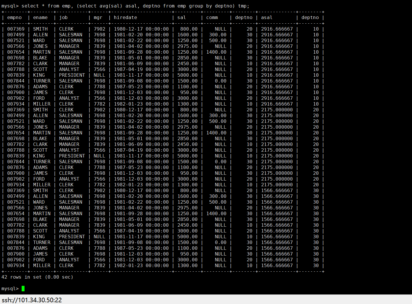 select * from emp, (select avg(sal) asal, deptno from emp group by deptno) tmp;