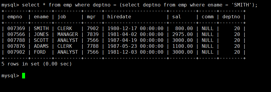 例如我们想要查询在emp表中和SMITH同一部门的员工,使用子查询的话,可以将SMITH的部门编号拿出来,再与表中所有员工的部门编号进行对比,找出与SMITH部门编号相同的员工。输入语句select * from emp where deptno = (select deptno from emp where ename = 'SMITH');
