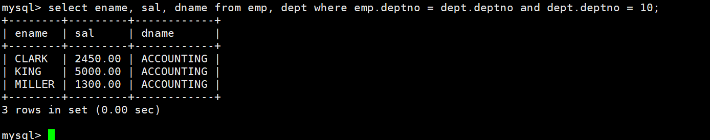最后我们再根据题干需要筛选出雇员姓名、工资以及所在部门,输入指令select ename, sal, dname from emp, dept where emp.deptno = dept.deptno;即可。