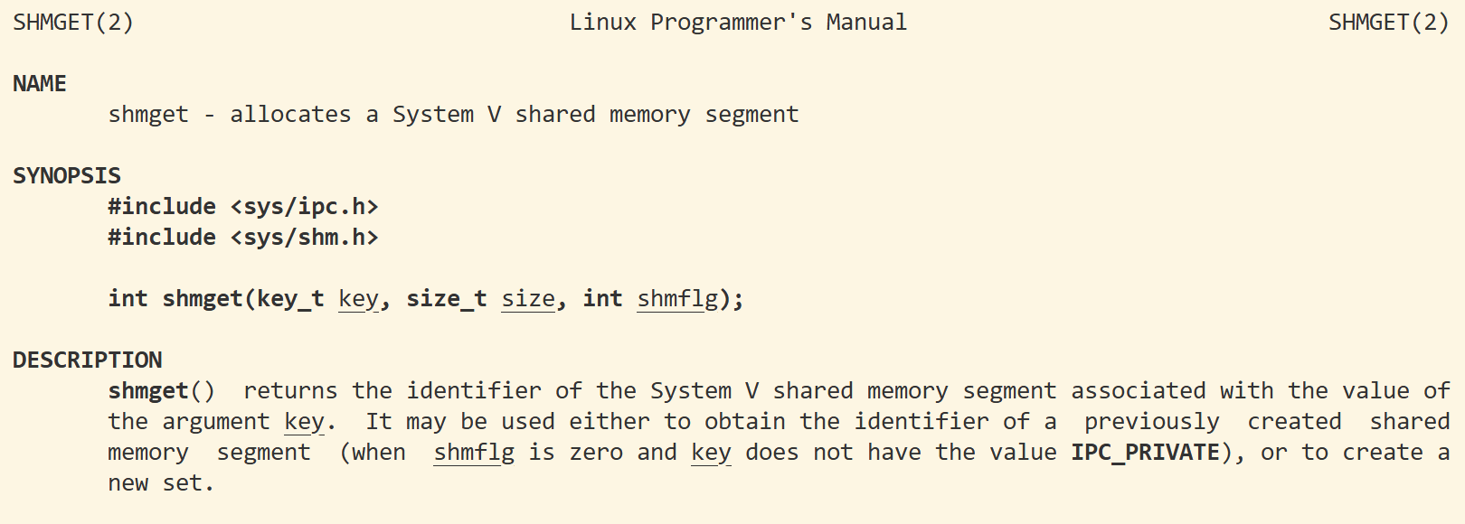 int shmid = shmget(key, SHM_SIZE, IPC_CREAT | IPC_EXCL | 0666);
