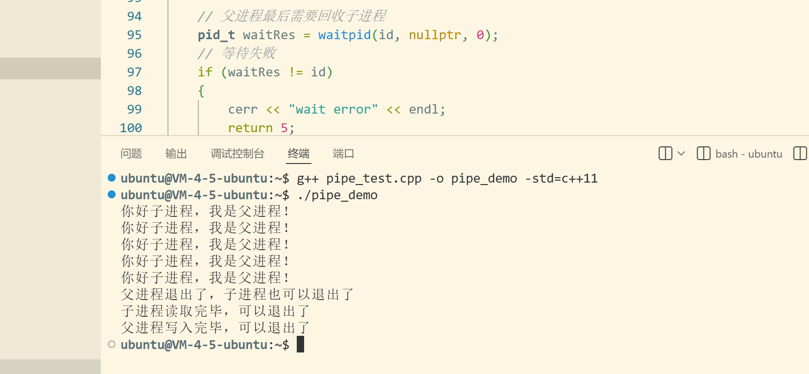 - 管道是自带同步机制的,它会自带访问控制,当管道满了的时候,写端进程不能再写入数据,必须阻塞式等待读端进程读取走数据才可以接着写入;当管道空了的时候,读端进程不能再读取数据,必须阻塞式等待写端进程写入数据才可以接着读取。
