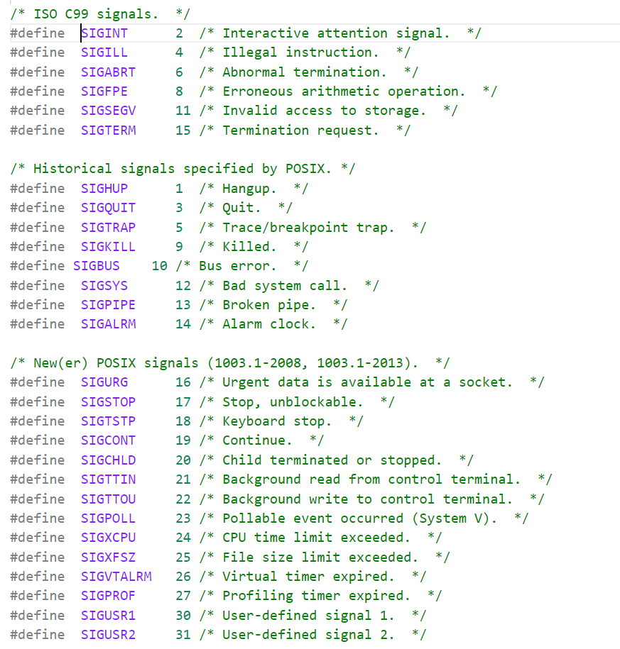 每个信号都有⼀个编号和⼀个宏定义名称,这些宏定义可以在signal.h中找到,例如其中有定义