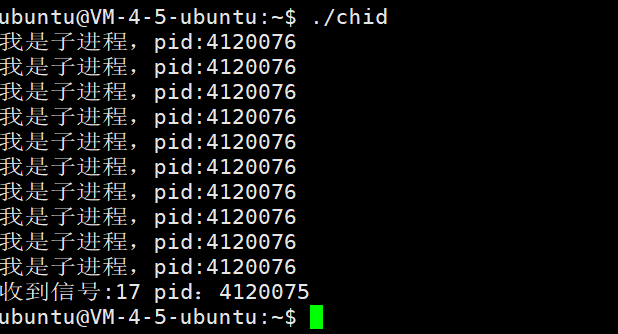 可以看到,子进程结束时发送了17号信号,所以SIGCHLD信号的使用可以让父进程在等待子进程的时候多了一种选择方式,以前如果子进程退出父进程需要回收子进程,但是父进程正在执行自己的任务不能被子进程的退出所打扰,那我们就只能把waitpid函数设置成WNOHANG非阻塞式等待,无论子进程退出还是没有退出,父进程都不会受到打扰。