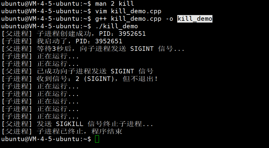 cout << "[父进程] 发送 SIGKILL 信号终止子进程..." << endl;